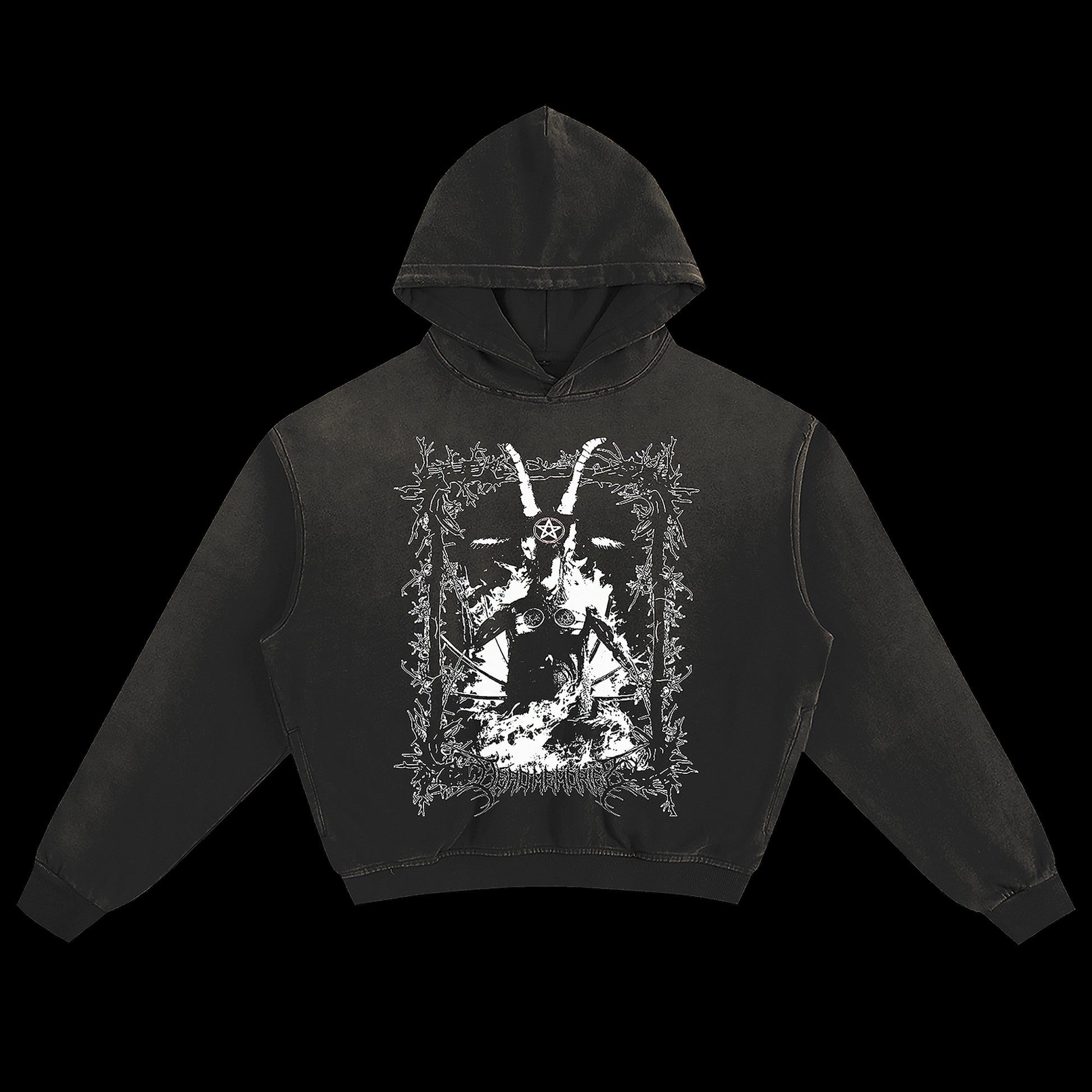 Black sunfaded hoodie in a distressed cotton with a boxy relaxed fit. Slight distressing around the edges and cuffs of the hoodie to add an authentic, vintage style. Features the "Dark in Hell" Logo print on the front.Β