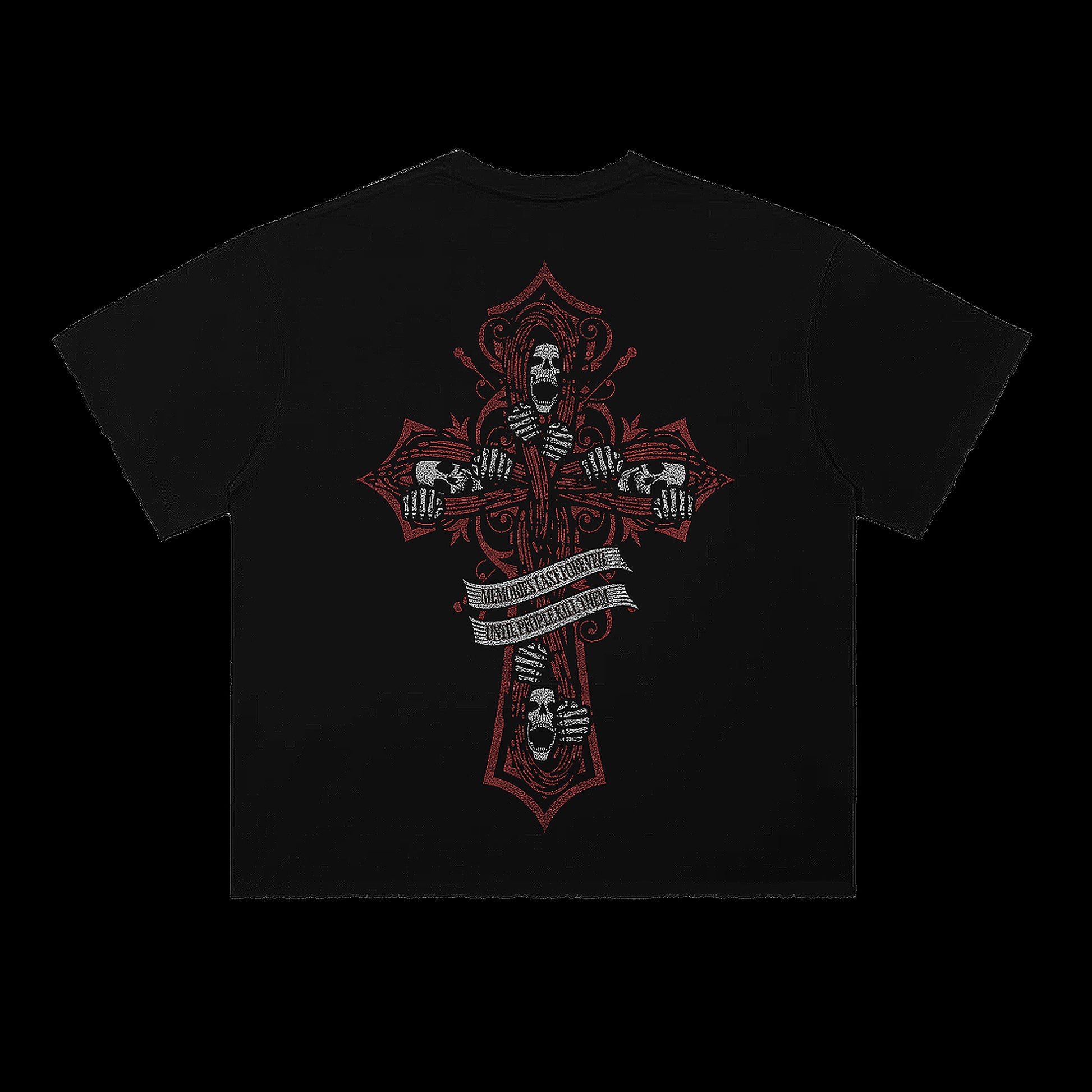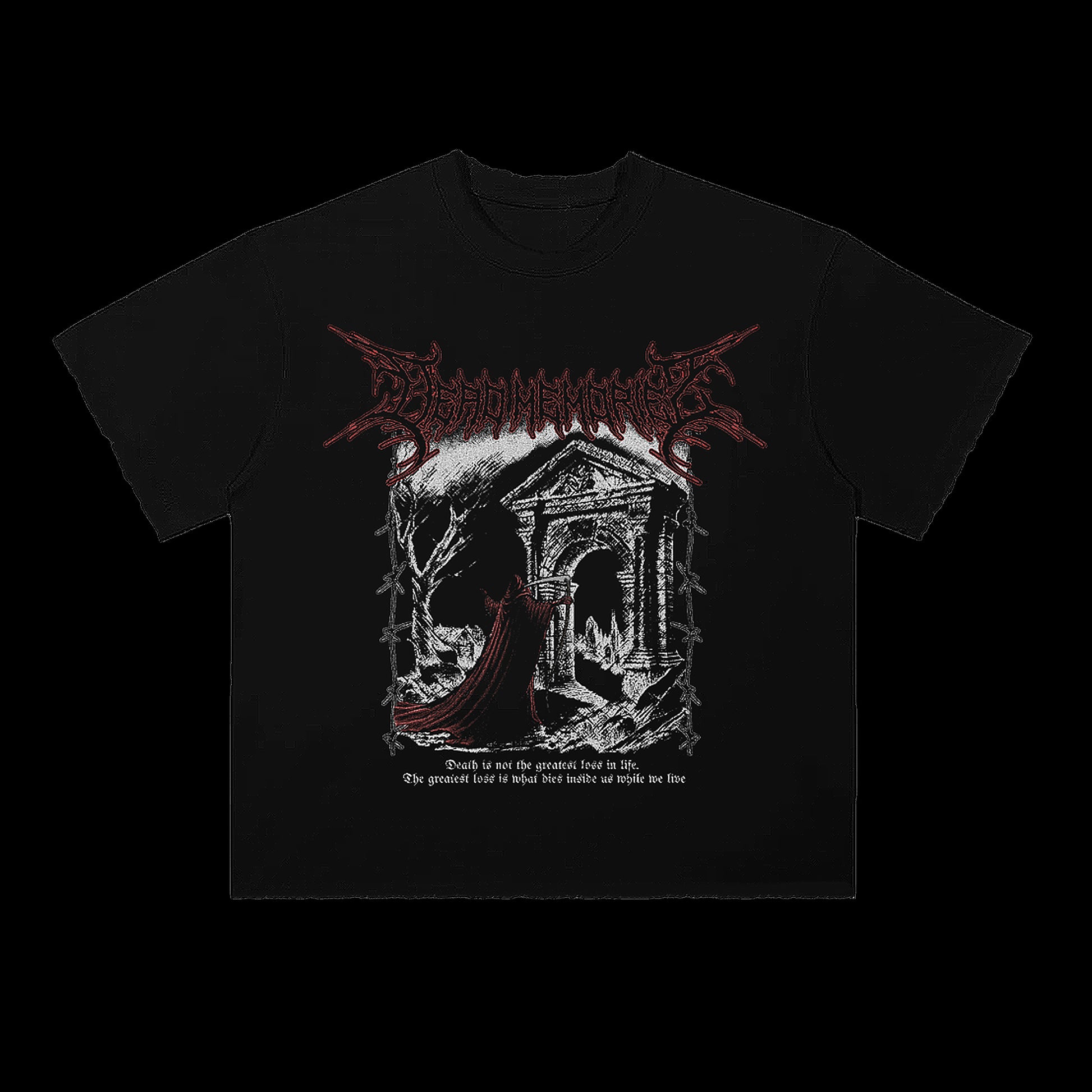 Black oversized T-shirt with a relaxed fit. Hand-distressed around the the neck, sleeves and waist to add an authentic, vintage style. Features the "Memories Last Forever" print on the front and back