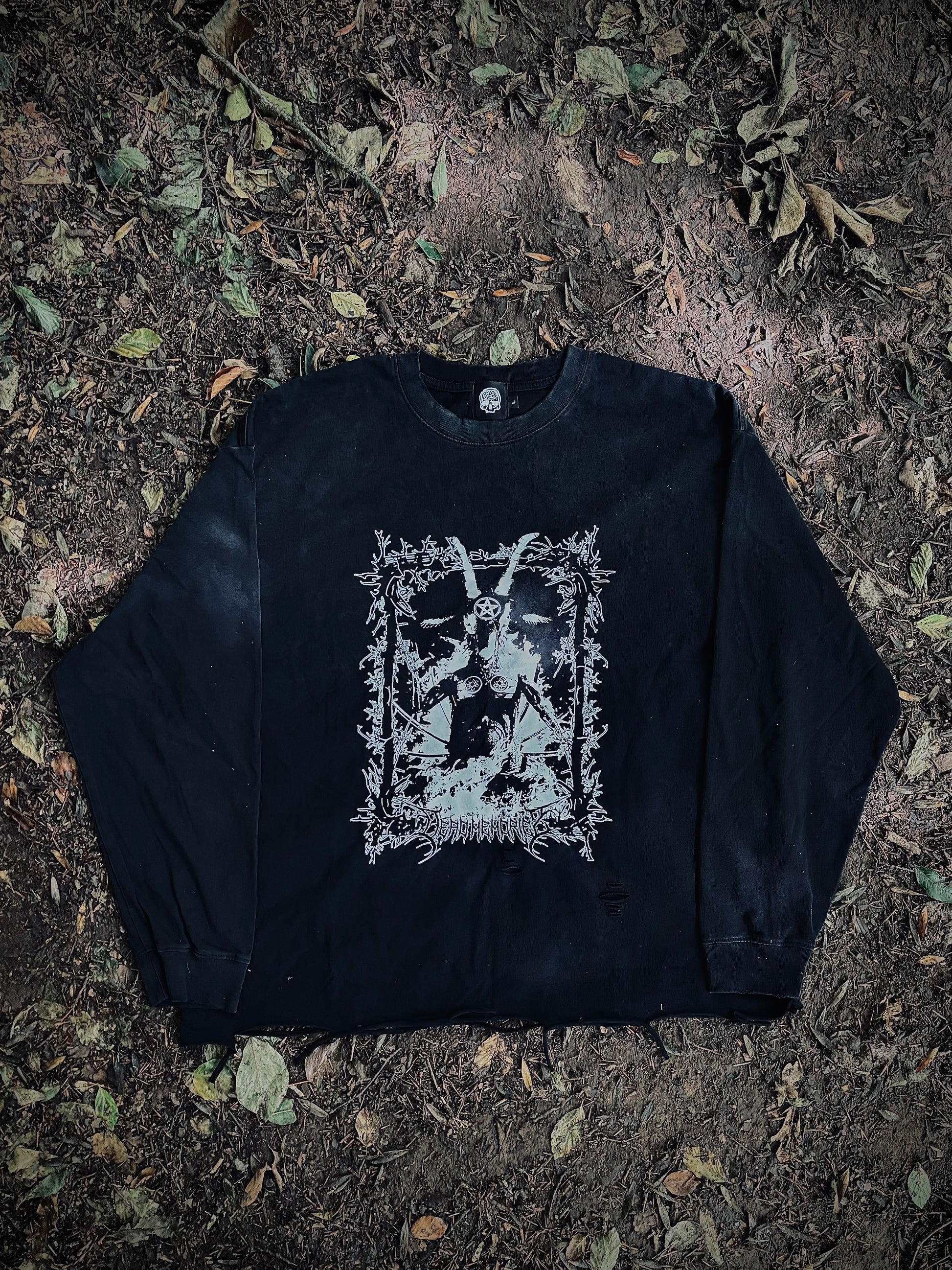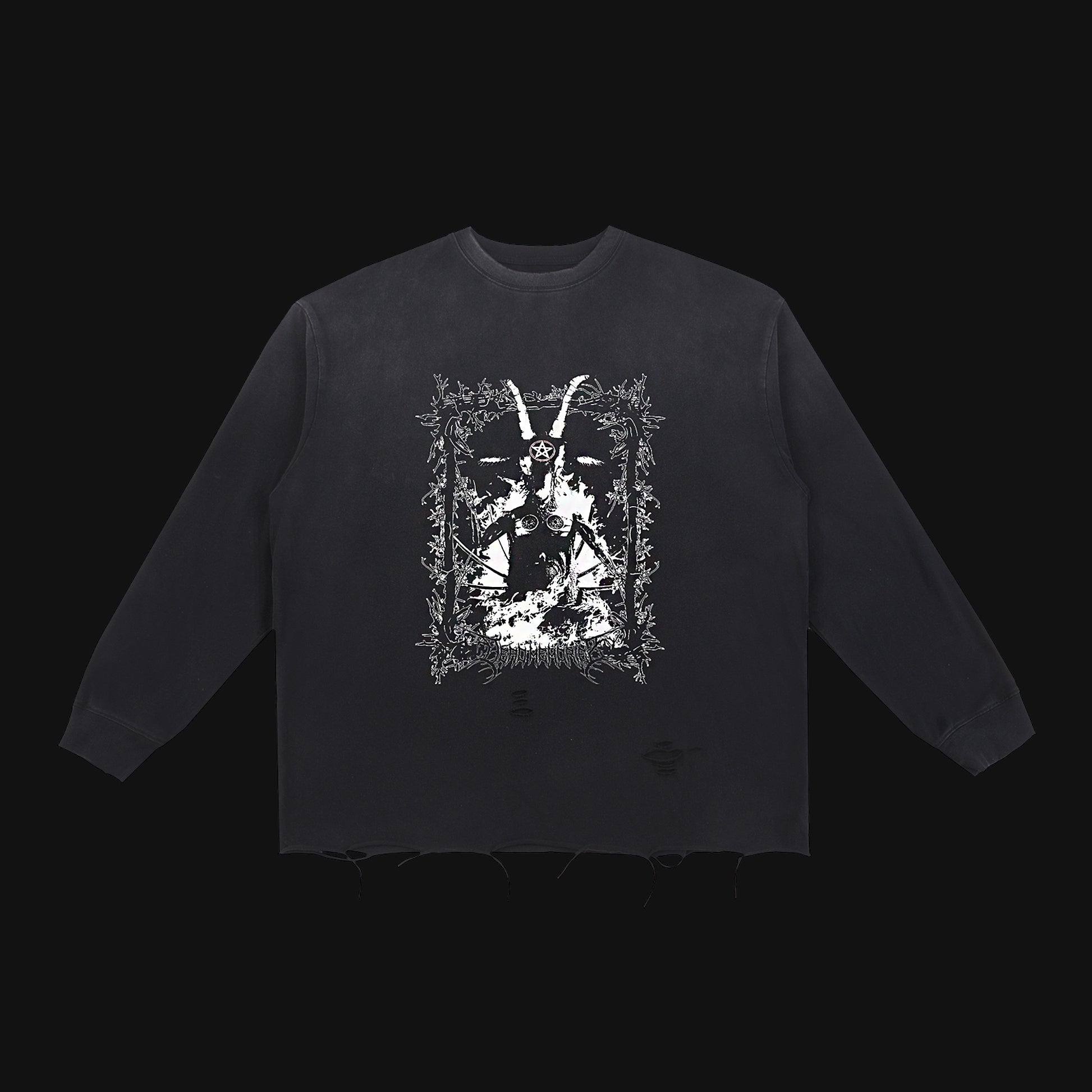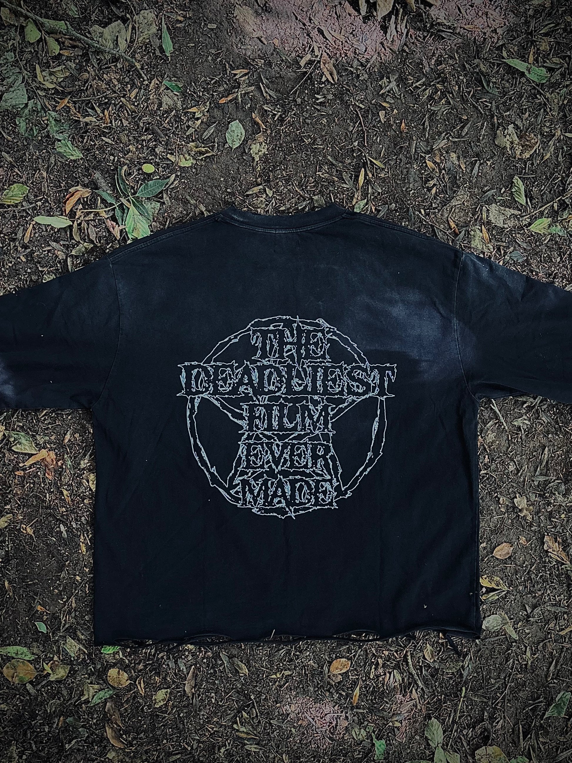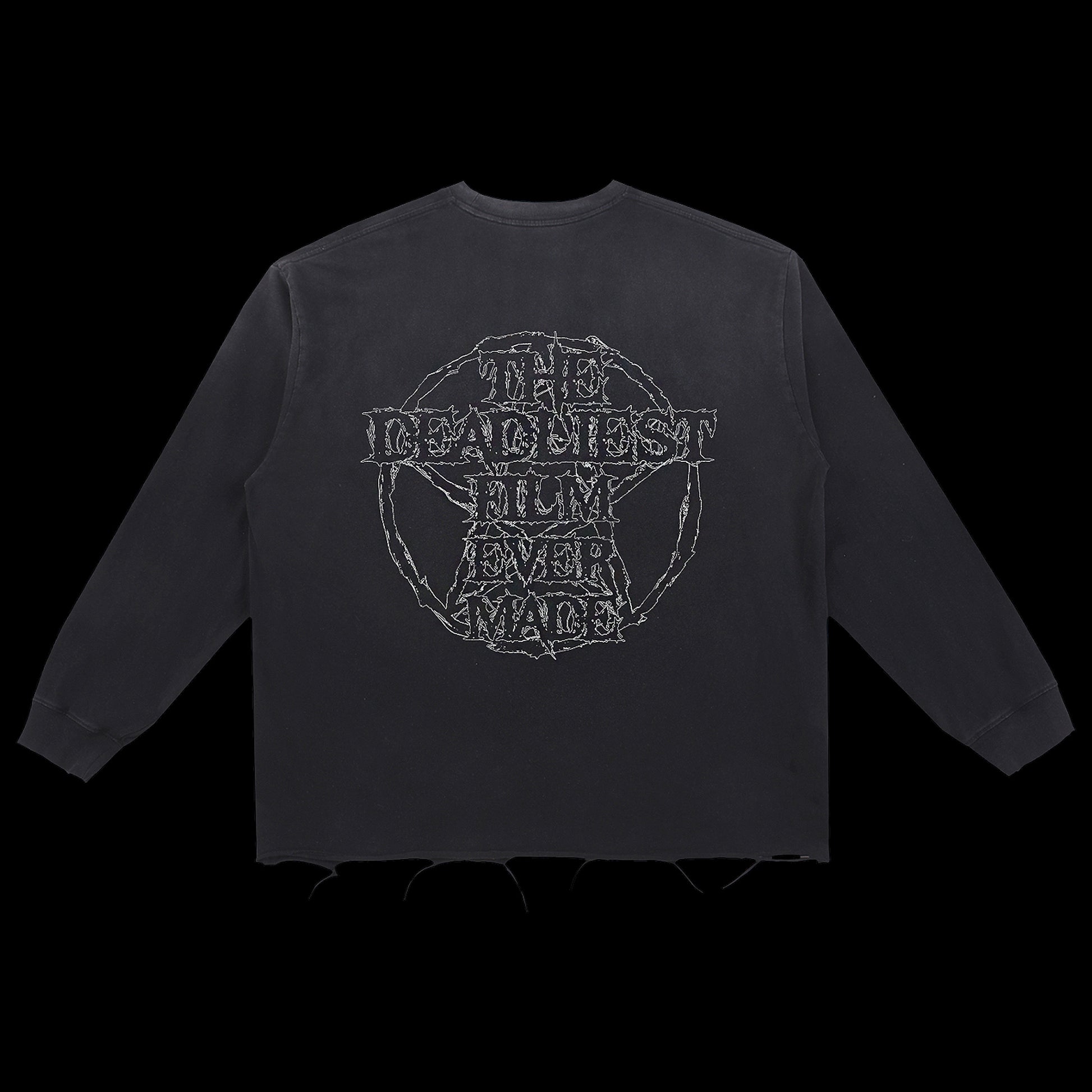 Washed black raw edge distressed long-sleeve with a oversized fit. Features the "Deadliest Film Ever Made" print on the front and back, in perfect time for halloween β οΈ.
