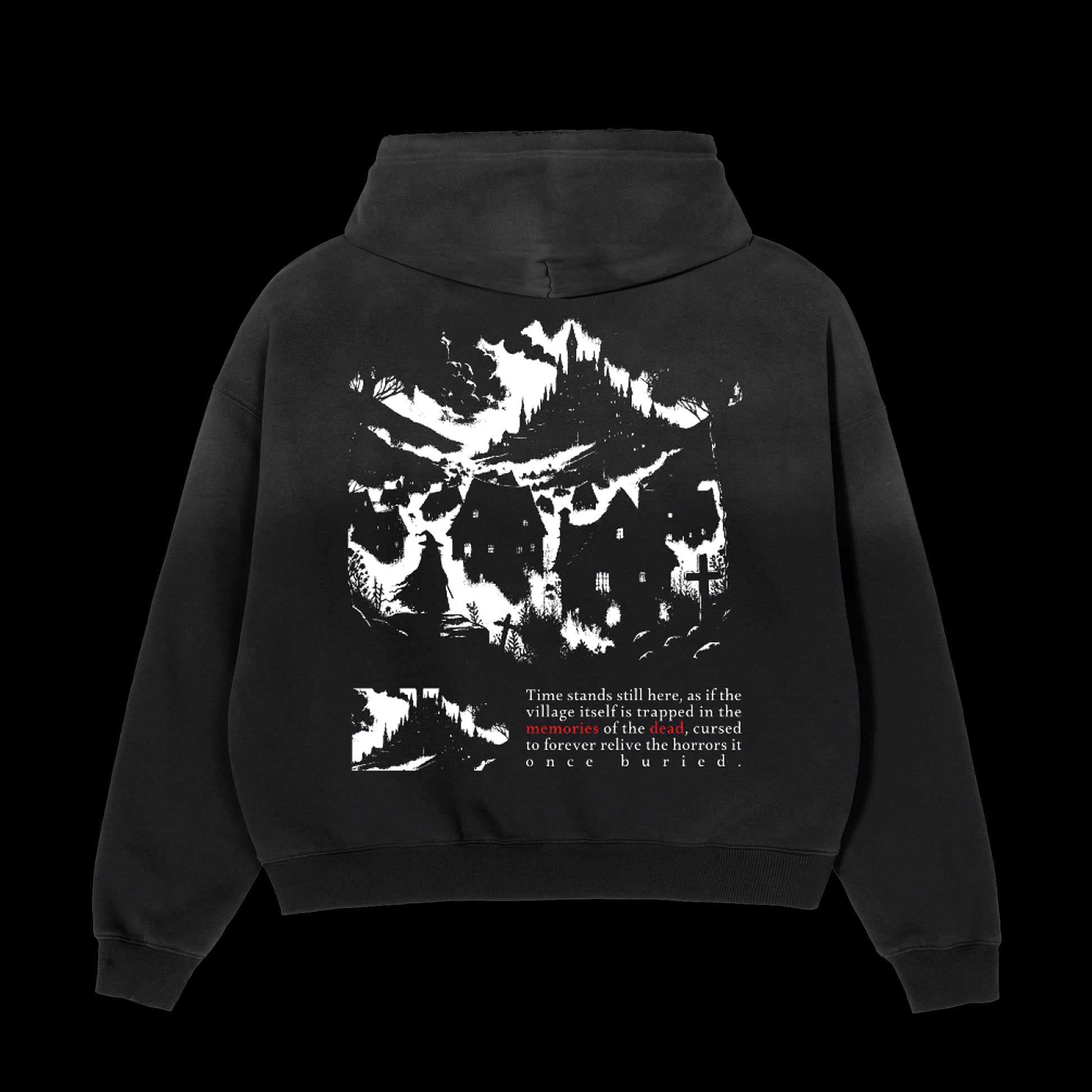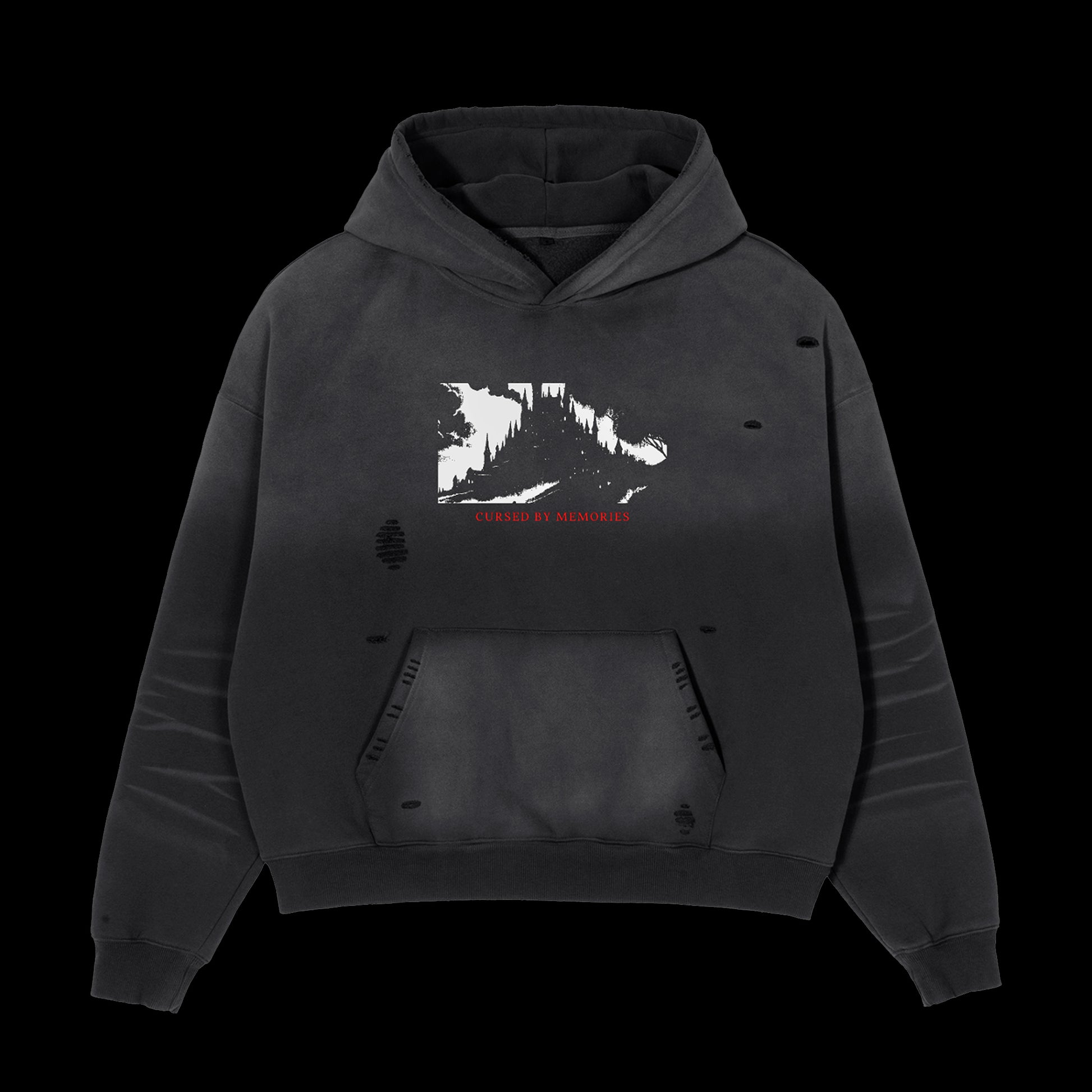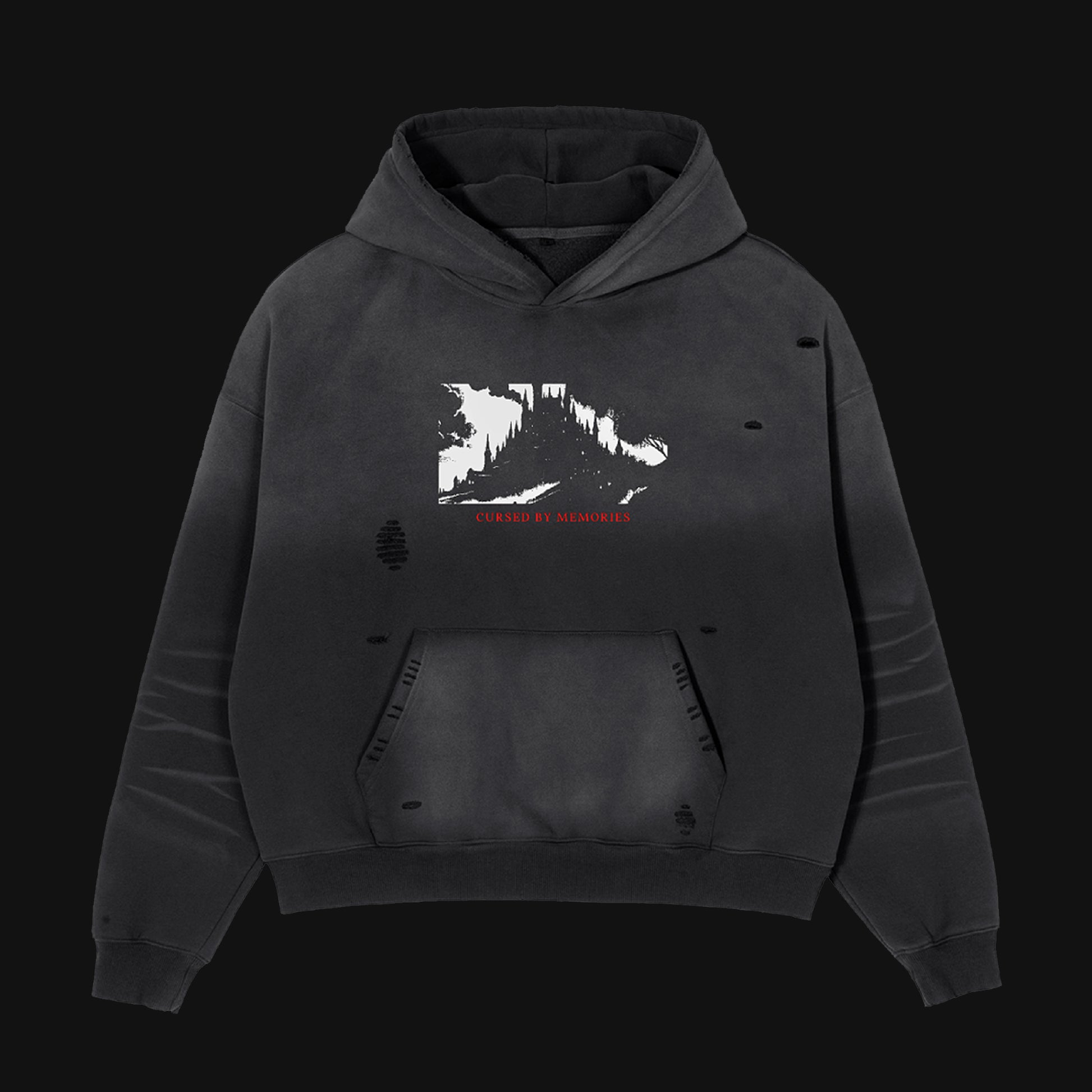 Black sunfaded hoodie in a distressed cotton with a boxy relaxed fit. Slight distressing over the front of the hoodie to add an authentic, vintage style. Features the "Cursed By Memories" Logo print on the chest and large back print.Β