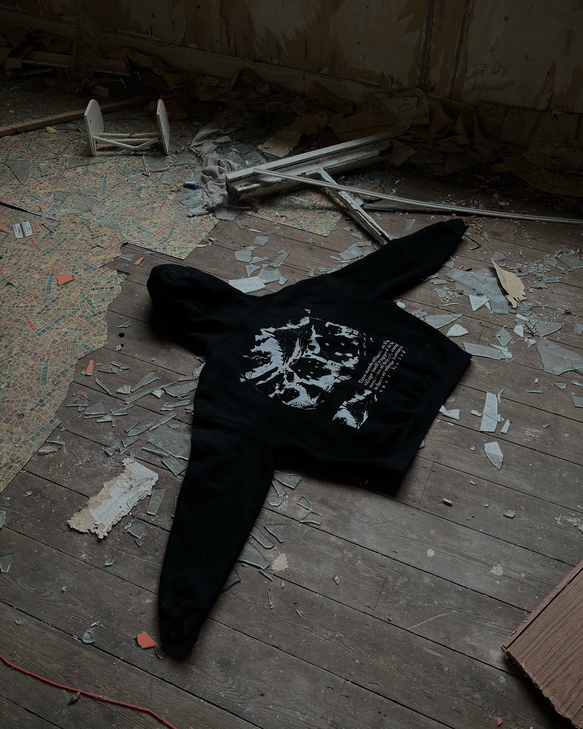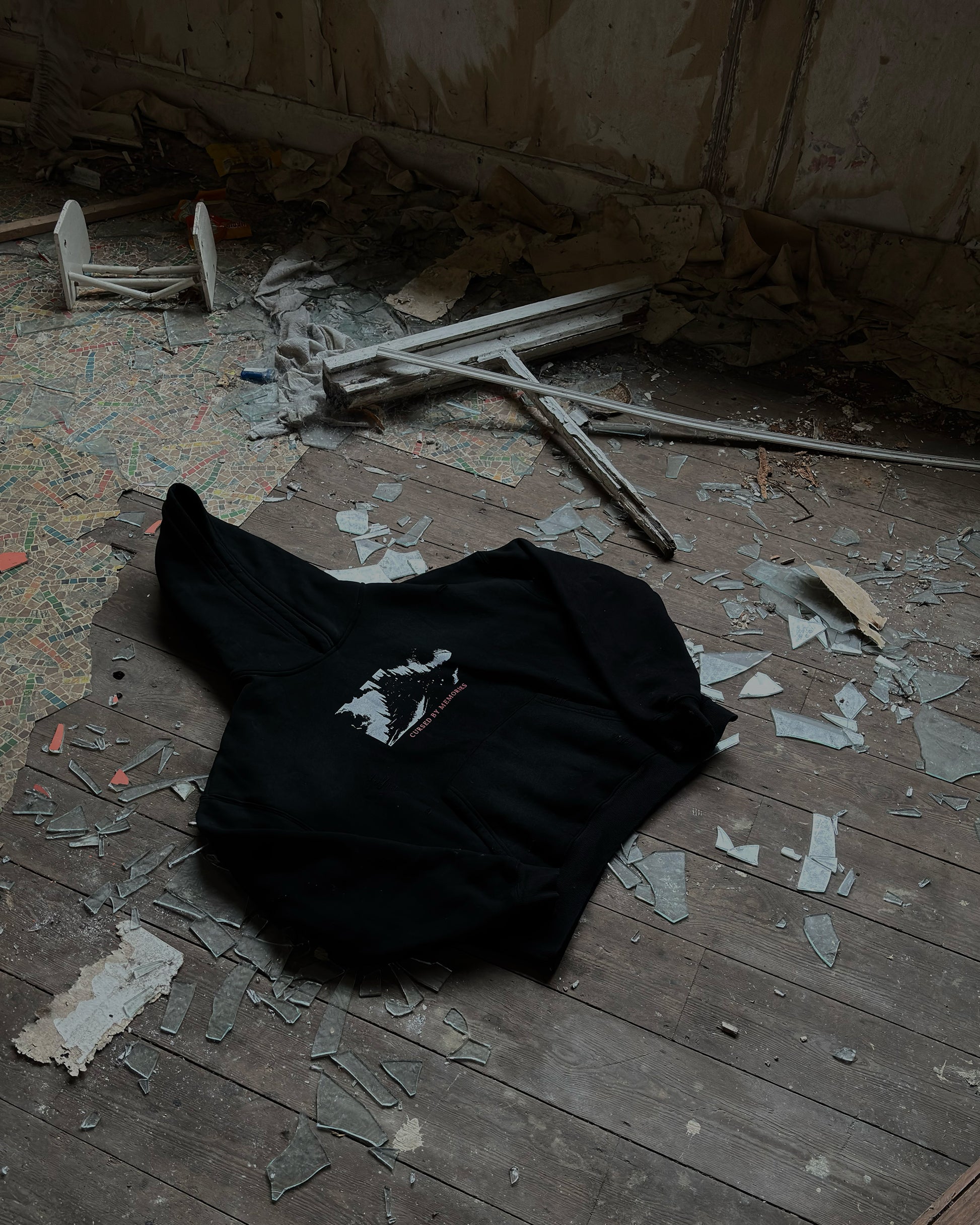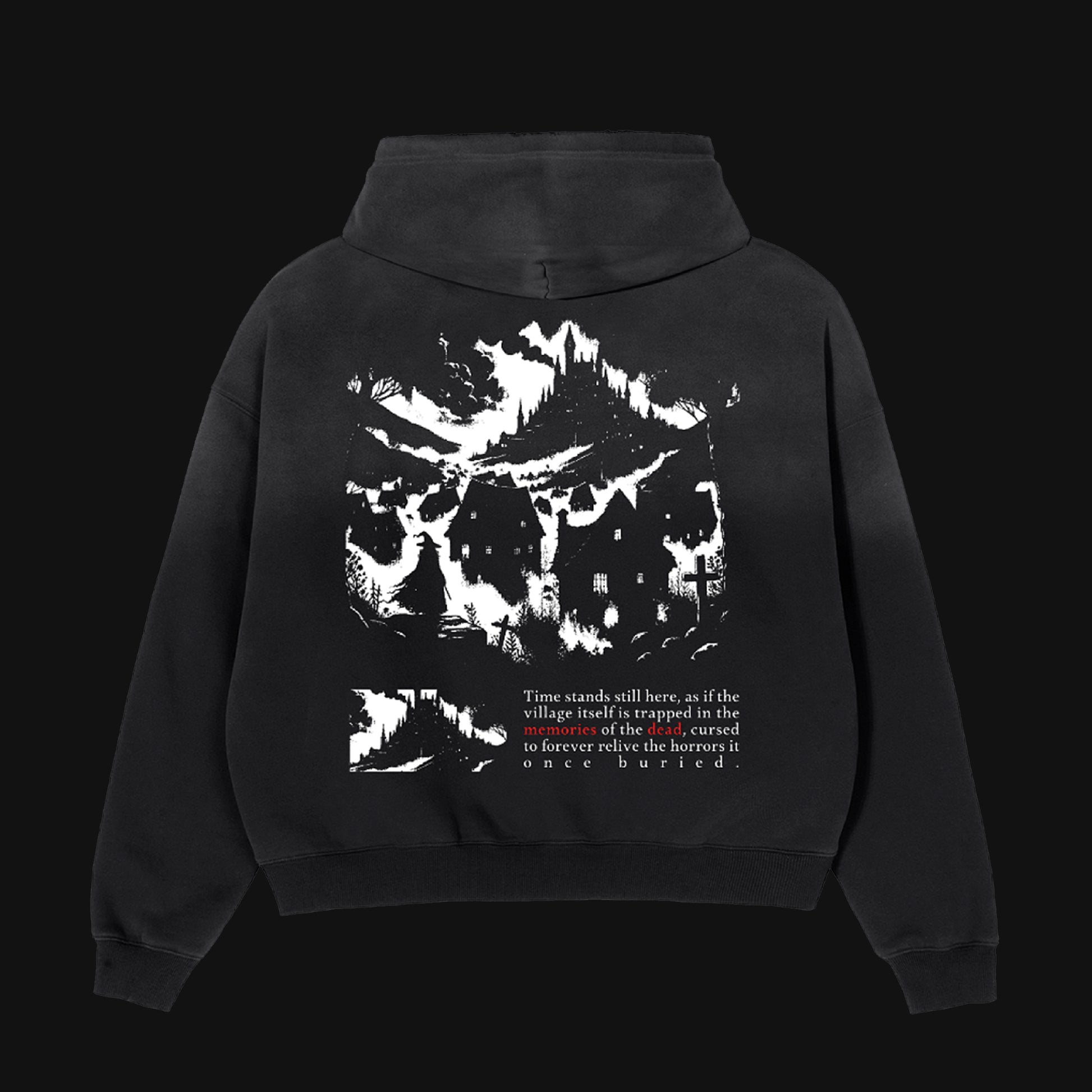 Black sunfaded hoodie in a distressed cotton with a boxy relaxed fit. Slight distressing over the front of the hoodie to add an authentic, vintage style. Features the "Cursed By Memories" Logo print on the chest and large back print.Β